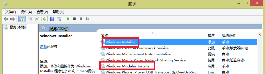在弹出的“服务”控制台程序中找到“Windows Installer”和“Windows Module Installer”服务